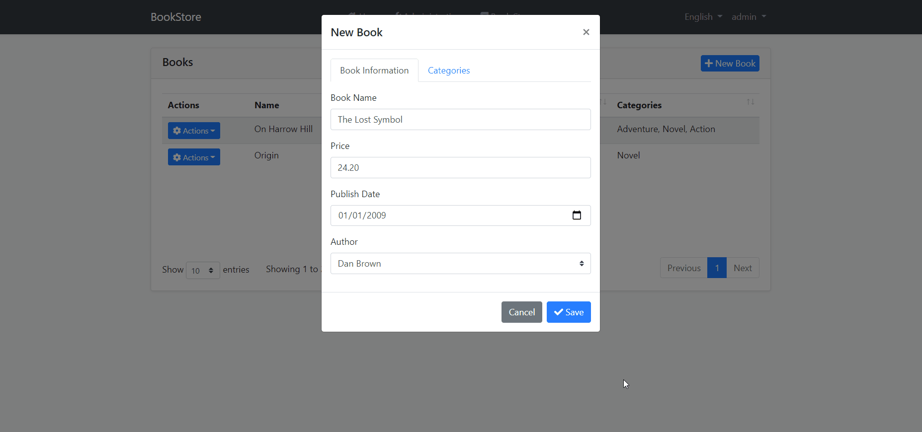 Here, we've got all categories and authors inside of the OnGetAsync method. And use them inside of the create modal to list them so the user can choose when creating a new book.