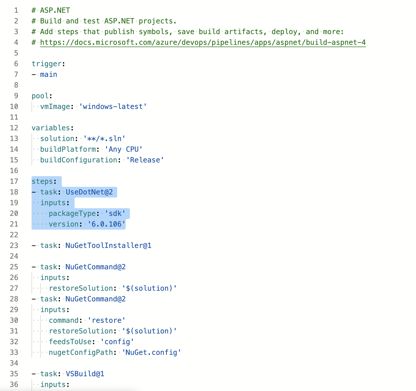 - task: UseDotNet@2 inputs: packageType: 'sdk' version: '6.0.106'