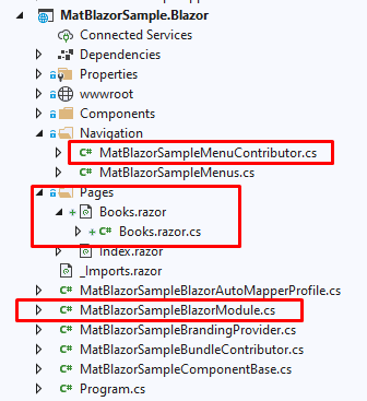 MatBlazorSampleBlazorModuleclass, call theAddMatBlazor()method from your project'sConfigureServices()method:public override void ConfigureServices(ServiceConfigurationContext context) { var environment = context.Services.GetSingletonInstance<IWebAssemblyHostEnvironment>(); var builder = context.Services.GetSingletonInstance<WebAssemblyHostBuilder>(); // ... builder.Services.AddMatBlazor(); } -