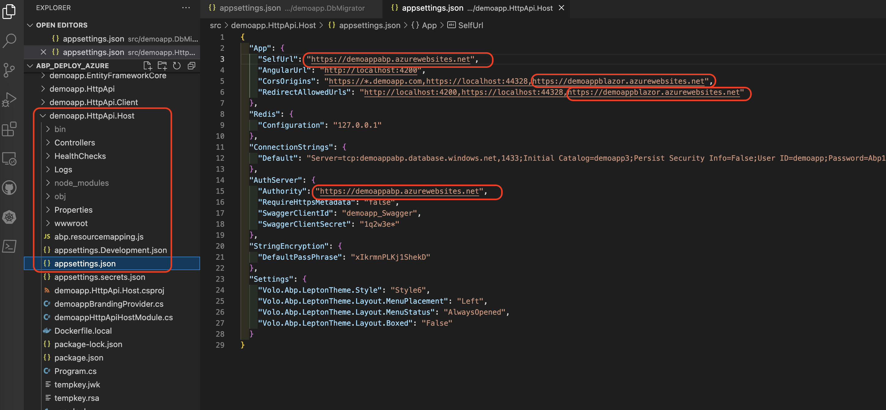 Copy/paste the appsettings.json files of the [YourAppName].HttpApi.Host and the [YourAppName].DbMigrator project