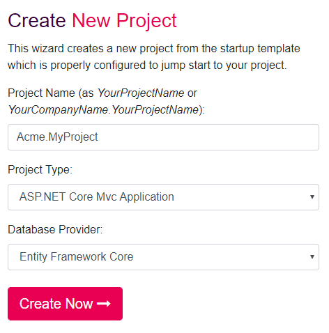 打开 https://cn.abp.io/Templates. 输入项目名称为 Acme.MyProject, 选择 ASP.NET Core Mvc Application 和选择 Entity Framework Core 做为数据库提供者.