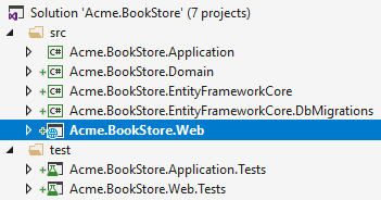 .Domainis the domain layer..Applicationis the application layer..Webis the presentation layer..EntityFrameworkCoreis the EF Core integration package.