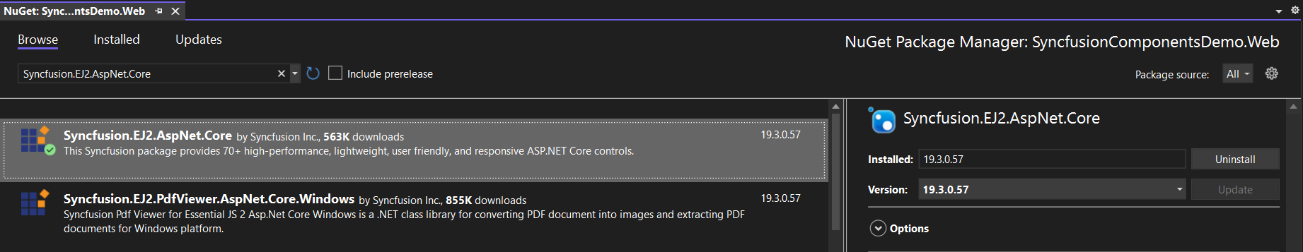 Syncfusion.EJ2.AspNet.CoreNuget package to our Web project (*.Web).